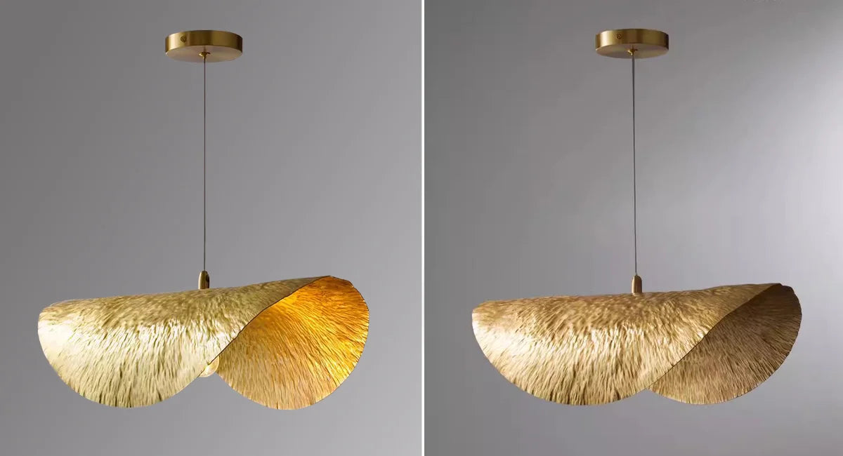 The Bris Pendant Light is crafted from solid copper in a gold lotus-leaf shape, using E14 LED bulbs and wall-switch dimming to cast warm or cool 3000K/6000K light over your dining table or kitchen, with an adjustable suspension wire for different ceiling heights and layouts.
