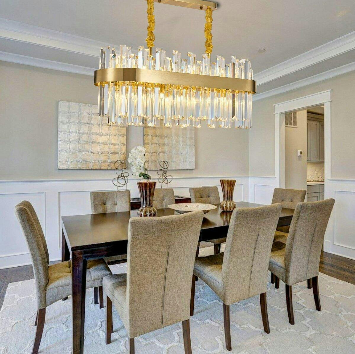 The crystal chandelier is a stunning and sophisticated lighting fixture, a brushed gold design, making it a perfect centerpiece for the dining room, and kitchen island. This type of chandelier is characterized brushed gold metal frame and cascading crystal adornments.