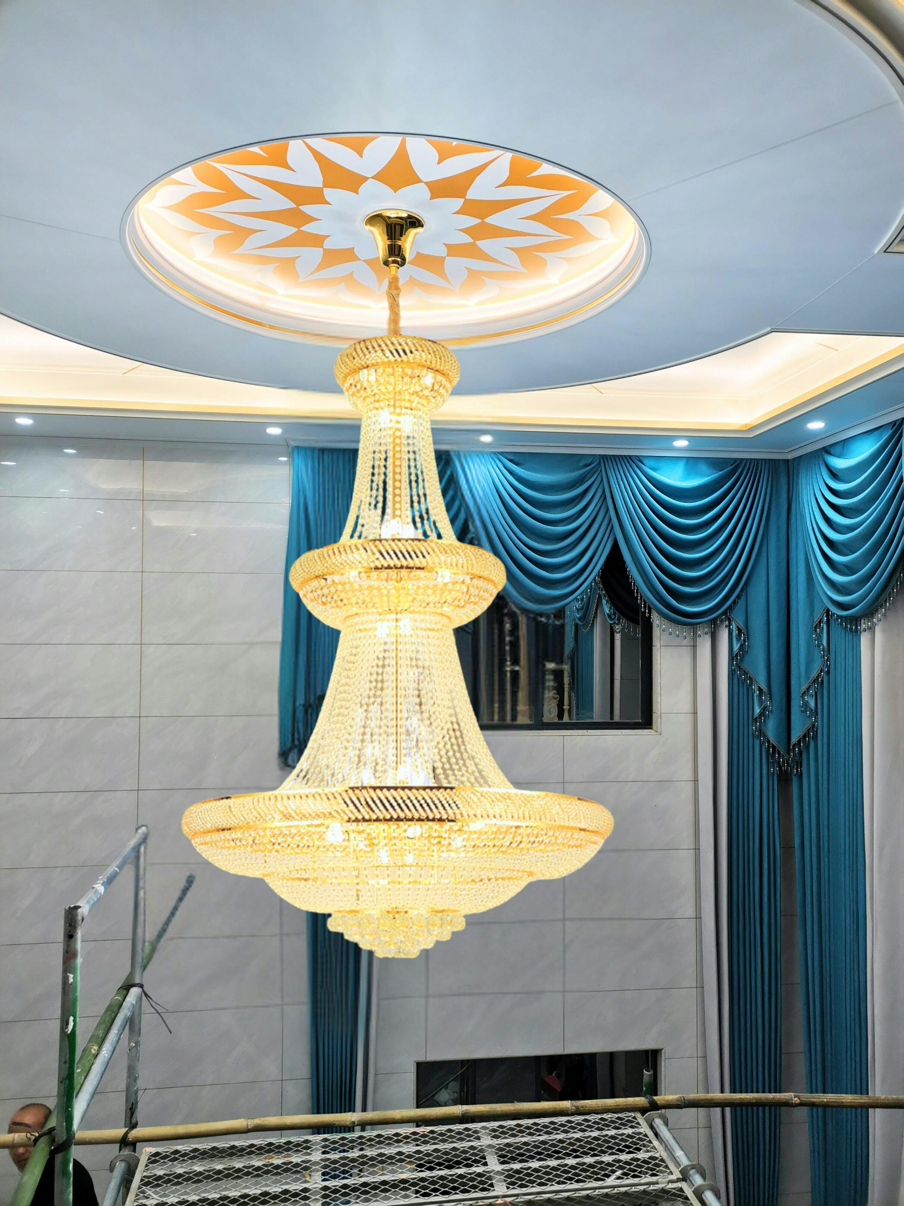 The chandelier has round shape, with multiple tiers of crystal pendants cascading down from a central point.The overall style of the chandelier is classic and elegant. It is perfect for use in formal areas, such as luxury villa, living rooms home decoration.