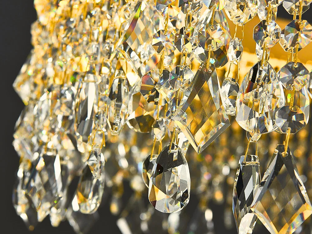 Perfect for living rooms, dining rooms, and bedrooms, this gold and crystal ceiling light is adaptable in size and color. It also accommodates installation on sloping roofs, adding flexibility to your installation choices.