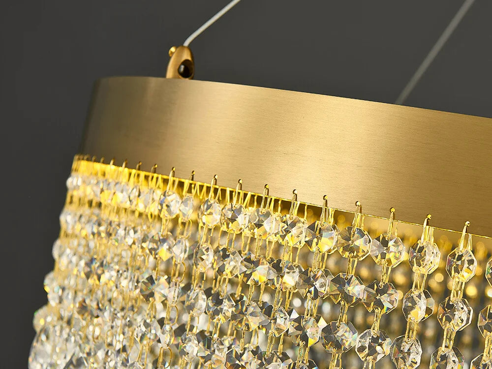 The Zara Modern Pendant Lights for Kitchen Island highlights a gold metal lamp body beautified with crystal strings, providing a gorgeous touch to any space. This rock crystal pendant light is adjustable with dimmable color temperature and line length, ensuring the perfect ambiance for your space.