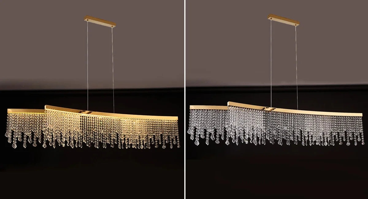 - Gold linear long metal lamp body with crystal string chandelier.