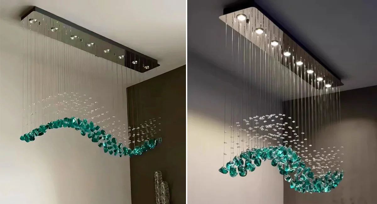 This stone crystal dining room chandelier and Zephy Dining Room Ceiling Lights is an ideal choice for interior decoration. Available in green, yellow, and clear stones, it can be customized in any size and height to fit your space perfectly. Crafted with a 1.0 stainless steel canopy, it is not only strong but also resistant to corrosion. The wave-shaped stone pendants add creativity and elegance, making it a stunning focal point.